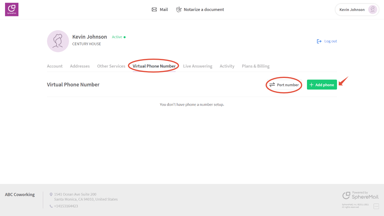- The third section titled "Virtual Phone Number" is where you can purchase the SpherePhone service or port your existing virtual phone number into your account. The SpherePhone service allows you to choose your desired number combination, add an area code from anywhere in the world, or choose to have a toll-free number.