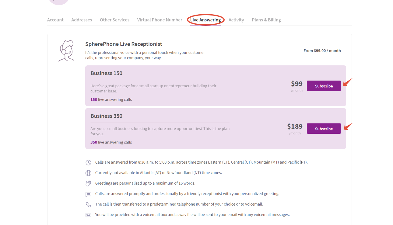 - The fourth section titled "Live Answering" is where you can subscribe to SphereMail's live answering service. This service allows you to hire a professional receptionist to answer your calls promptly with your personalized greeting.