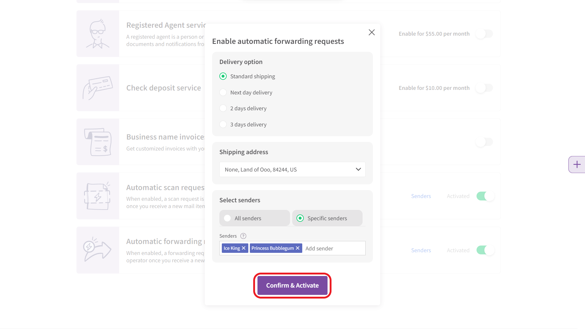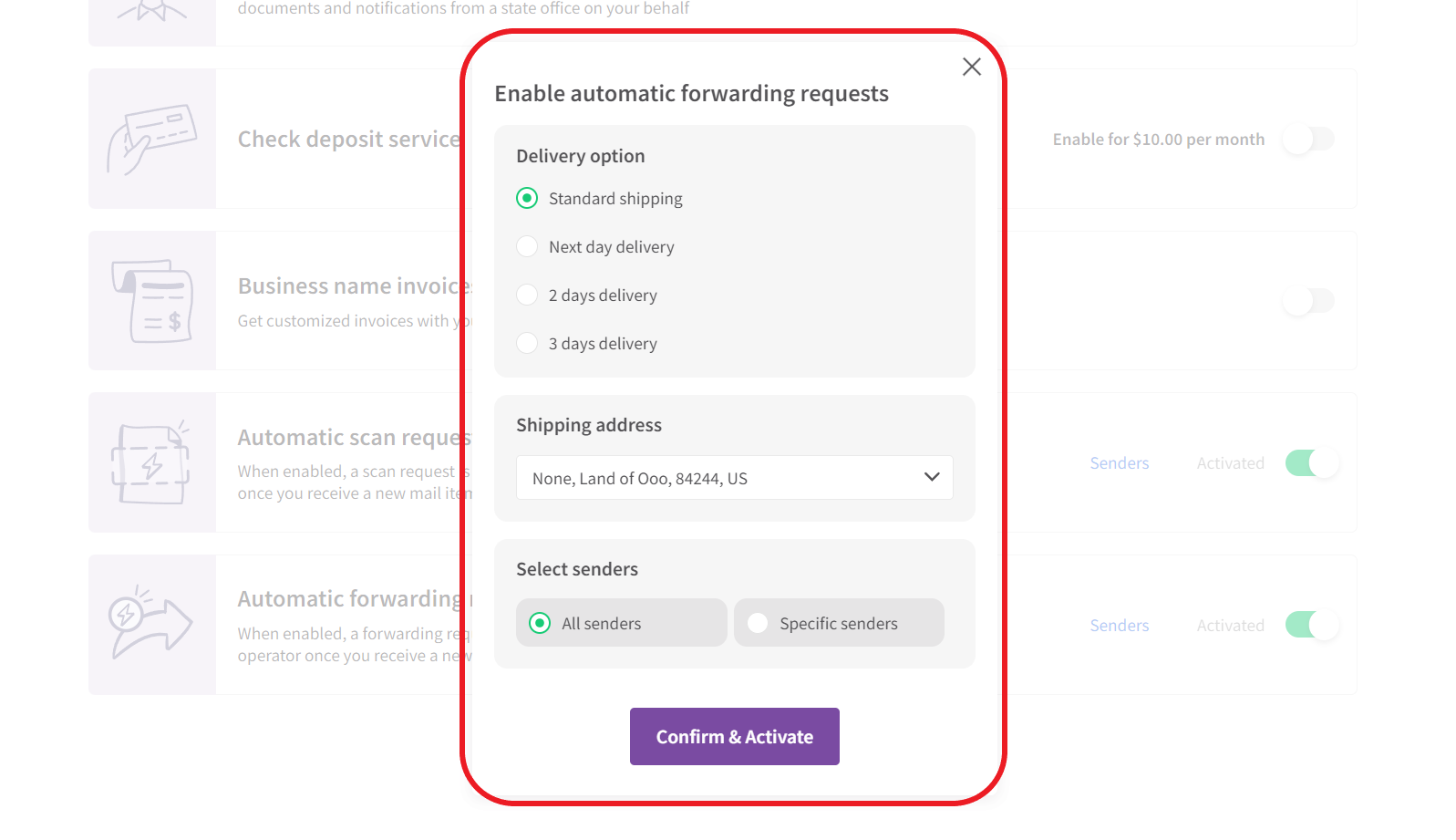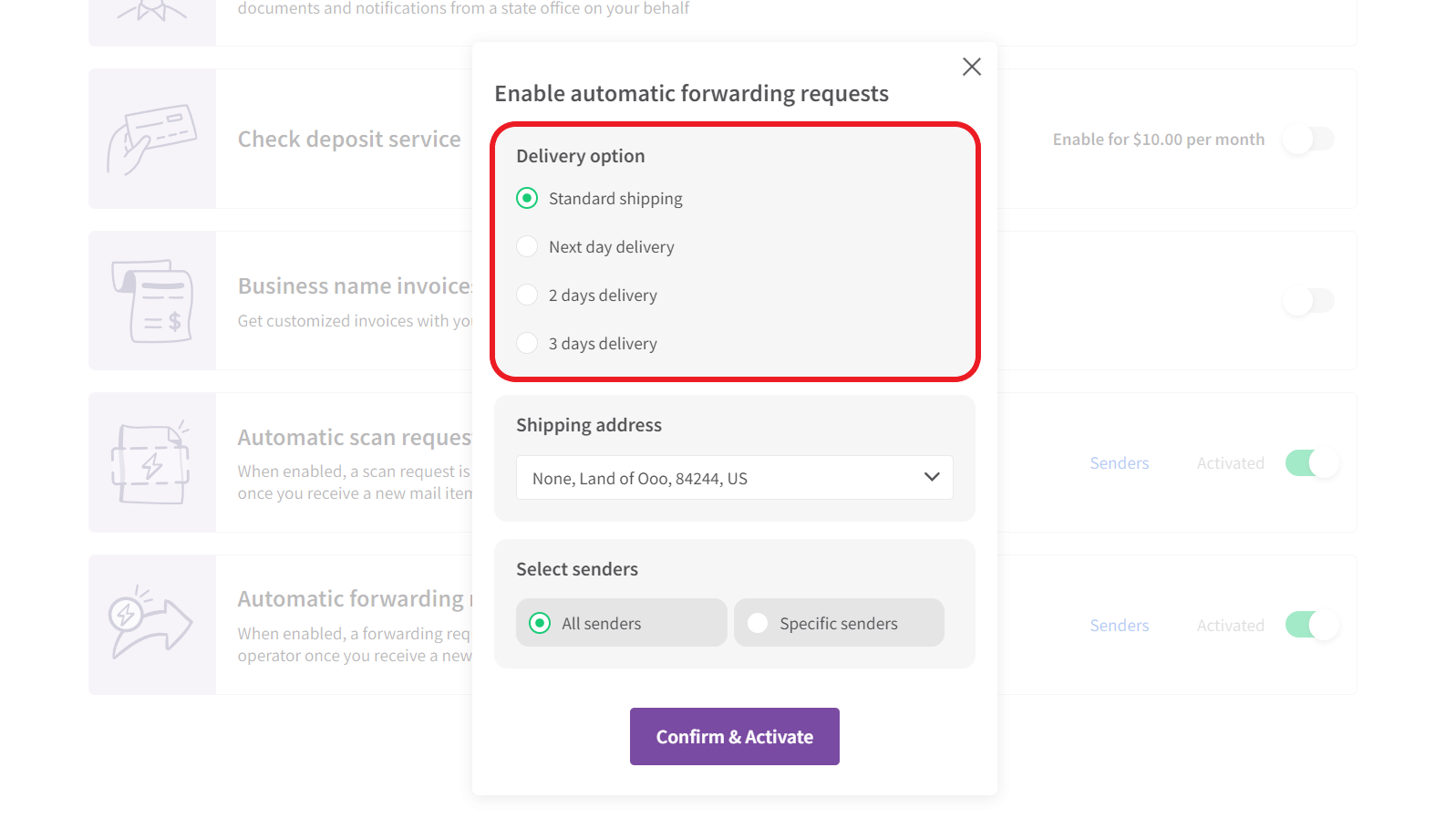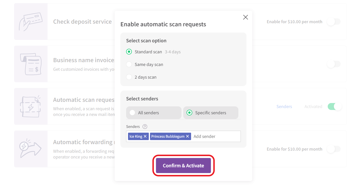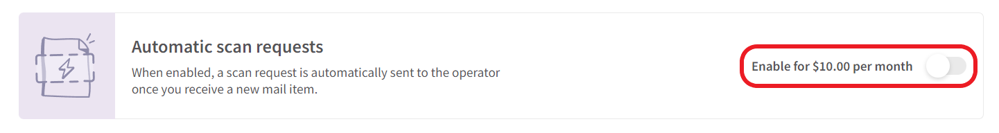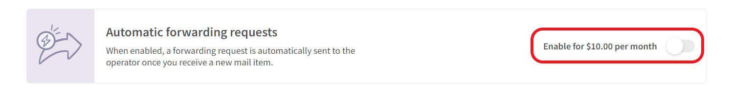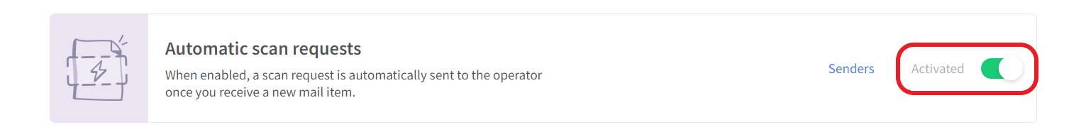 You can now enable automatic mail requests like scanning and forwarding to be automatically sent to your operator whenever they log a new mail item you've received! You can choose to send requests for all new mail items or choose specific senders for this to apply.