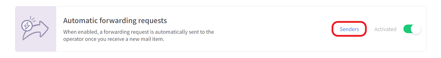 - You can also choose to have automatic forwarding requests sent to your operator for every new mail item logged from this point onward, or you can specify certain senders to apply this to: